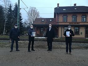 Danach fuhren Matthias Gastel und Peter Albert nach Hüfingen weiter, wo man sich mit dem Ortsvorsteher von Hausen vor Wald – Hans-Peter Münzer – zu einer Stadtführung traf. Peter Albert führte die kleine Gruppe durch die Hüfinger Altstadt und wies auf die geschichtlichen Hintergründe und die markanten Bauwerke der alten Baarstadt Hüfingen hin. Danach ging es in den Hüfinger Ortsteil Hausen vor Wald, wo man sich mit der Ortschaftsrätin Ingeborg Reitze und dem Hüfinger Bürgermeister Michael Kollmeier beim stillgelegten Bahnhof verabredet hatte.