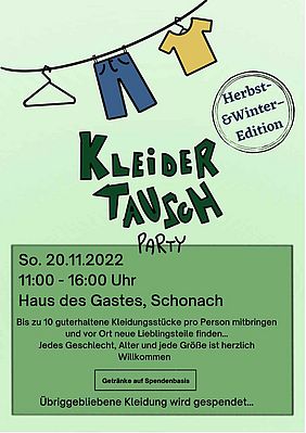 Am Sonntag, 20. November, findet von 11 bis 16 Uhr im Foyer des Haus des Gastes in Schonach der zweite Schonacher Kleidertausch statt. Mitbringen kann man bis zu zehn gut erhaltene Teile in allen Größen aus Herbst- und Winterkleidung.