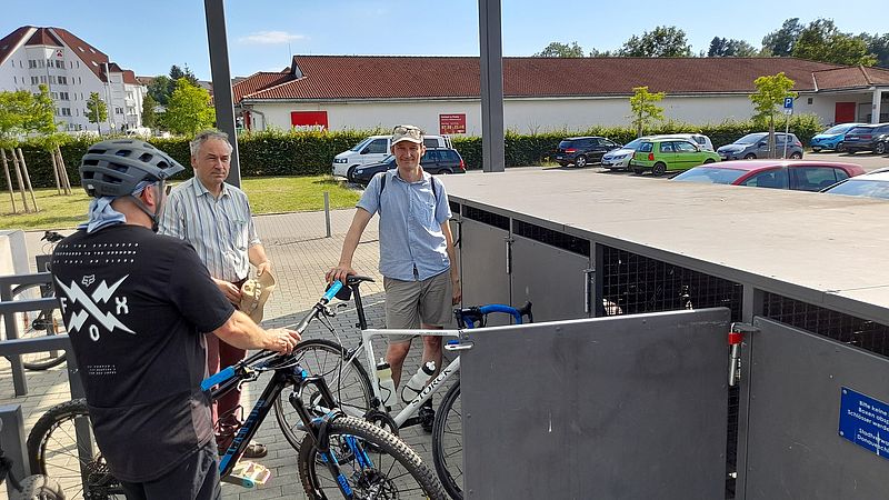 Nächste Station der gemeinsamen Radtour war die Carsharingstation und die neuen Fahrradboxen am Bahnhof Donaueschingen. In der Friedrich-Ebert-Straße an der Südseite des Bahnhofs stehen aktuell zwei Carsharing-Fahrzeuge, davon eines von „Mobile Baar“, einem ehrenamtlich getragenen Donaueschinger Verein, der an Stadtmobil Südbaden angeschlossen ist. „Insgesamt gibt es in Donaueschingen aktuell fünf Carsharing-Fahrzeuge, außerdem weitere Fahrzeuge in Hüfingen und Bräunlingen“, so Gerhard Bronner von Mobile Baar e.V.. Hermino Katzenstein vermisste auf Anhieb eine Fahrradabstellanlage direkt bei den Carsharing-Fahrzeugen, wurde aber auf die wenige Meter entfernte, erst vor Kurzem neu gebaute Fahrradstation mit zahlreichen Anlehnbügeln und abschließbaren Fahrradboxen verwiesen.