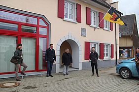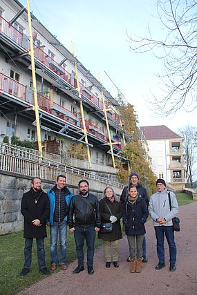 „Lazarett“: MdB Chris Kühn (dritter von links), Gemeinderätin Annie Bronner (Mitte) und Christian Kaiser (hinten) sowie weitere Interessenten ließen sich vom Verwaltungsbeirat des ehemaligen Lazaretts Mark Sailer sowie dem Bewohner und Sprachschulleiter Johannes Schwab die Besonderheiten dieser großen Eigentümergemeinschaft und frühen Donaueschinger Konversionsprojekts erläutern.