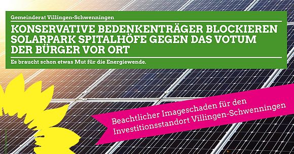 Im technischen Ausschuss des Gemeinderates wurde die Errichtung des Solarparks Spitalhöfe durch CDU, FW, SPD und FDP torpediert. Damit setzten sich die Gegner leichtfertig über den ausdrücklichen Wunsch des Ortschaftsrats Pfaffenweiler und die positive Einschätzung von Umweltexperten hinweg.